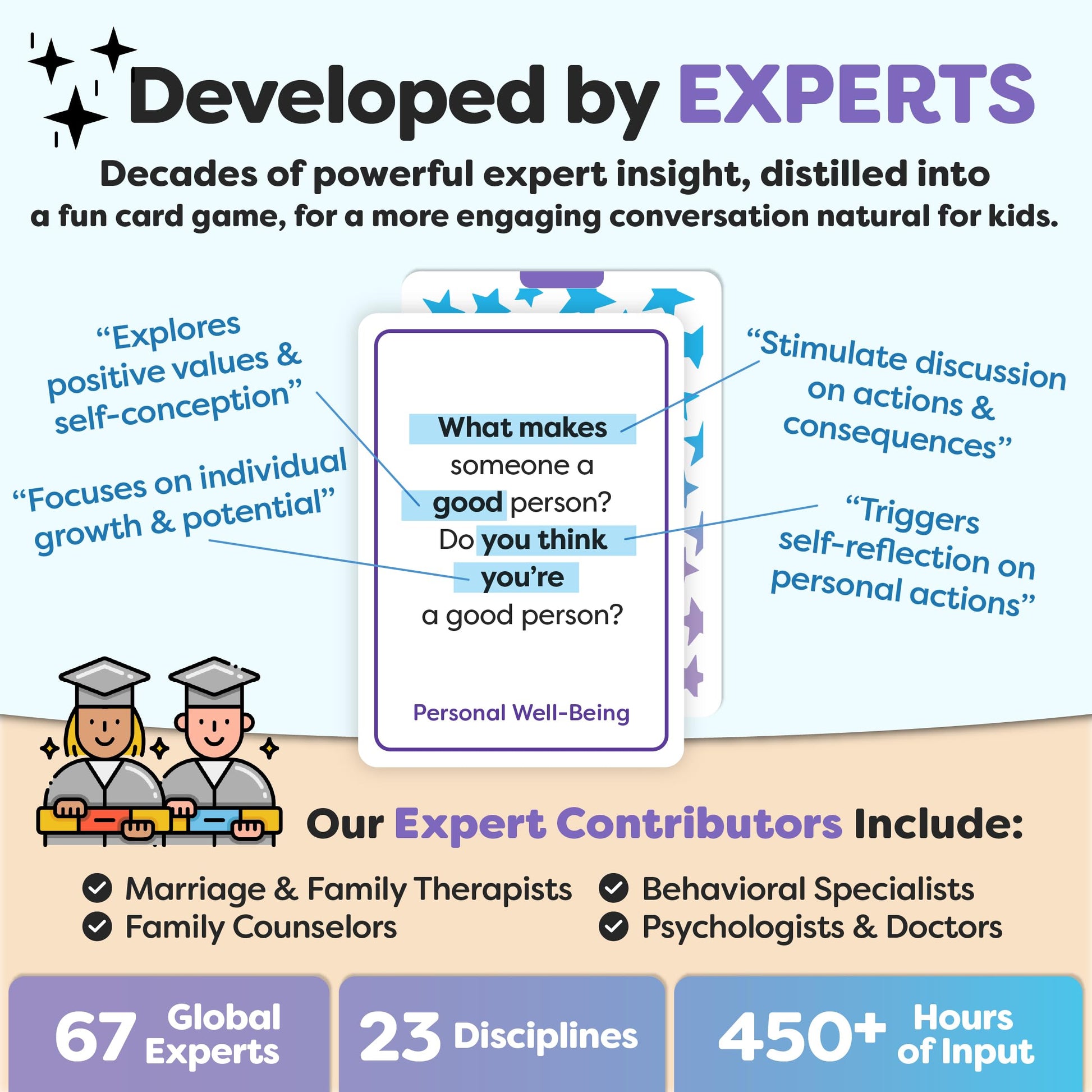 - TAILORED JUST FOR KIDS - 5 great categories: ‘School’, ‘Home & Family’, ‘Personal Well-Being’, ‘Future’, and ‘Fun & Random’ are each expertly written to meet a child in their special phase of life. So grab a card, ask the question and listen! A great relationship starts with great communication. Developed in partnership with practicing family therapists, psychologists, psychotherapists, communication experts and real families
