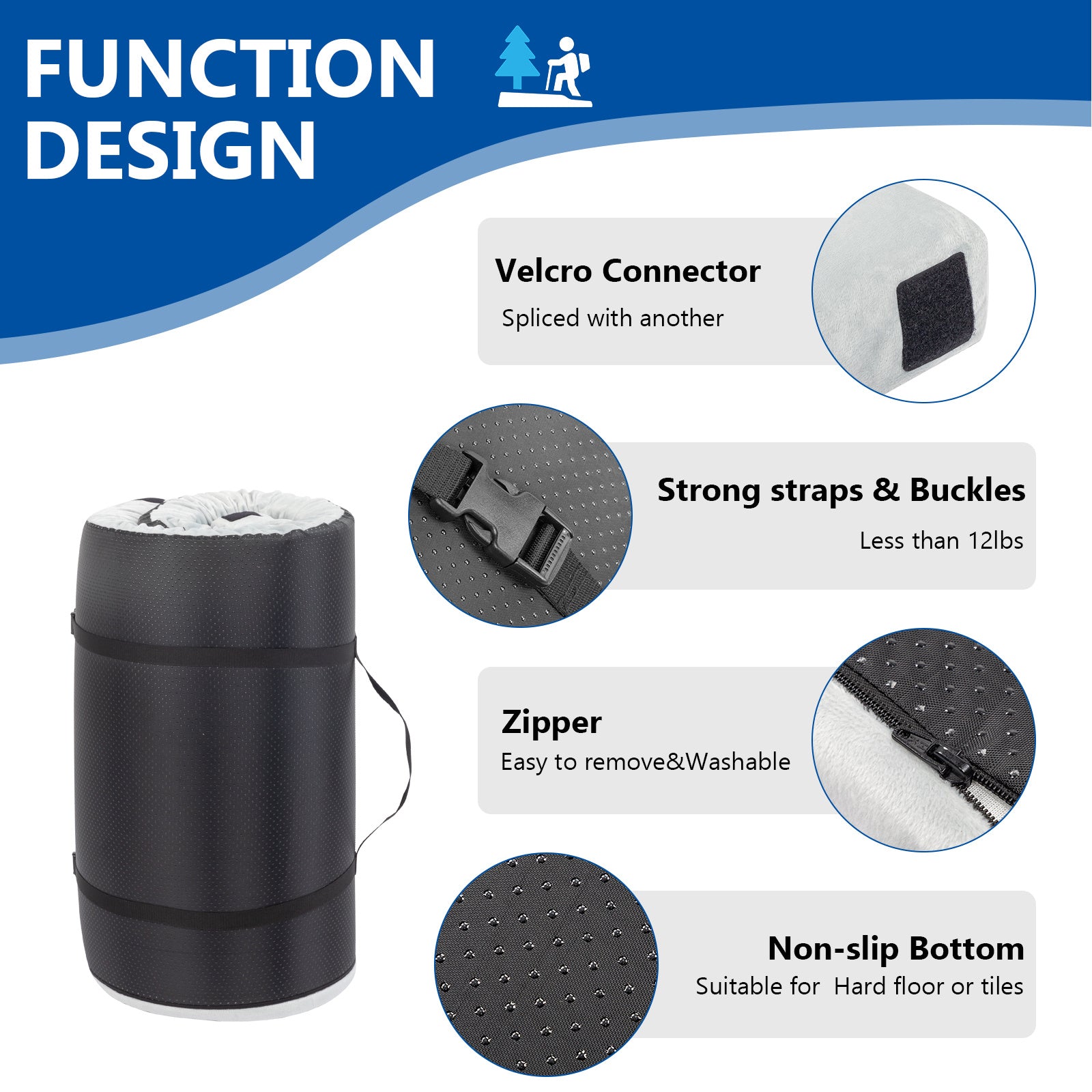 Versatile mattress. The sleeping mat is great for traveling or a car bed, tent camping, guest bed, floor bed, college dorms, and floor mattress for adults to use. Eight velcro connectors in the corner design make it easy to fasten to fit more persons, you can create your custom sleeping pad. This sleeping pad will be a good choice if you are looking for a camping bed, floor mattress, kids play mat, pet cot, cot mattress pad or car mattress.