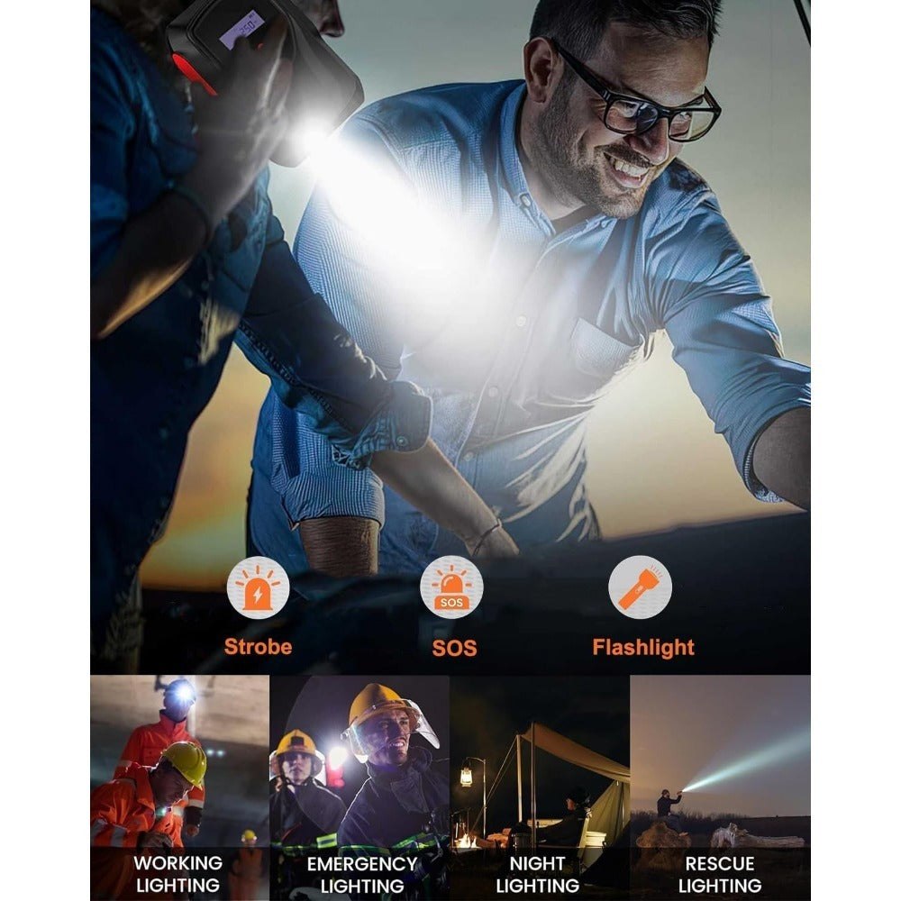 【3 Modes LED Flashlight】Our jump box for car battery is a LED flashlight with 3 lights modes: Flashlight, Strobe, SOS, Red. 400-lumen lighting lasting 48h, this emergency jump box for car battery is a life-saving helper in dark environments such as camping, emergencies, and travel. The LCD screen indicates the remaining power, ensuring a reliable phone charger in your car.