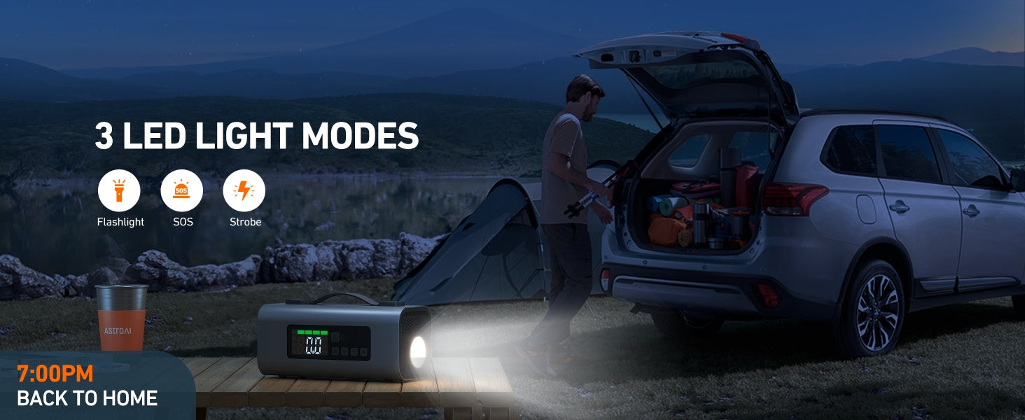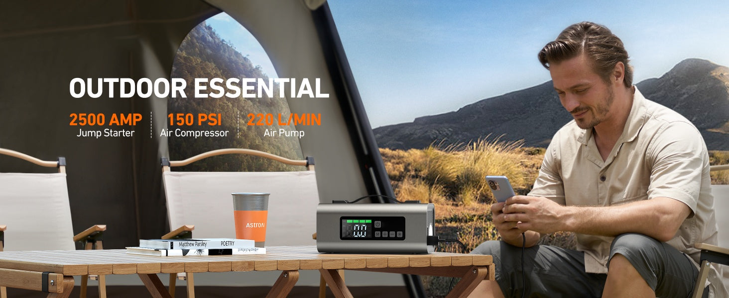 - Multifunctional - The MF159 jump starter includes 3 key integrated functions. It's a 14800 mAh portable car jump starter, up to 150 PSI air compressor, and a 220 L/min air pump. It can also be used as a power bank and LED flashlight. This 3-in-1 multi-function tool is a must-have in any road trip kit.