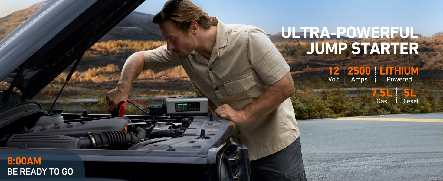- Ultra-Powerful Jump Starter - With a built-in 2500 A peak current, this battery jump starter can start 7.5 L gas and 5.0 L diesel engines quickly and efficiently; even with fully-dead batteries below 9 V.