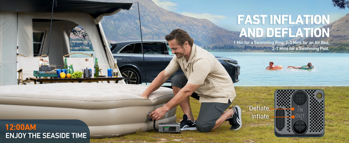 - Fast Inflation & Deflation Air Mattress Pump - MF159 Jump Starter achieves fast inflation & deflation in minutes. It includes an air hose and 4 different nozzles to inflate or deflate air mattresses, lounges, rafts, waterbeds, boats, and other large inflatables. Its automatic shutoff design allows for supervision-free inflation and deflation, reducing exposure to noise. When you inflate, please align the hose and accessory nozzle, twist them clockwise along the threads.