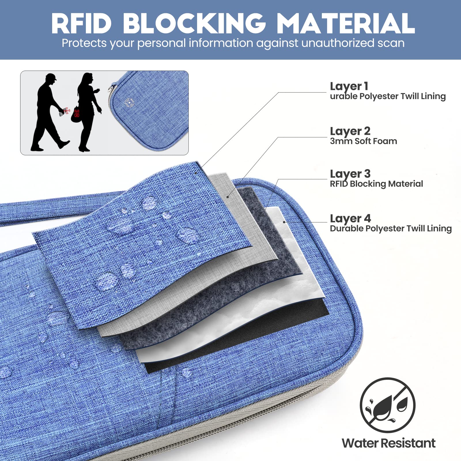 Crafted from lightweight, waterproof material with a durable SBS zipper, this travel wallet is built to withstand the demands of any journey. For added peace of mind, it also features advanced RFID shielding to help protect your personal information from unauthorized scans. Whether you're heading out on a weekend getaway or an extended trip, this travel document organizer keeps everything secure, accessible, and well-organized.