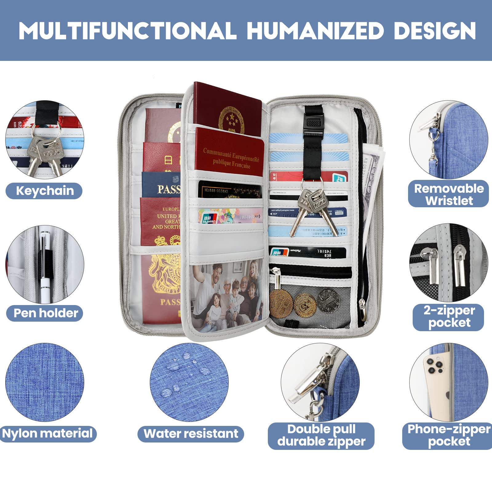 Passport Wallet, RFID Passport Holder with Vaccine Card Slot, for Family and Women & Men, Travel Document Organizer with Removable Wristlet Crossbody Strap (Blue)