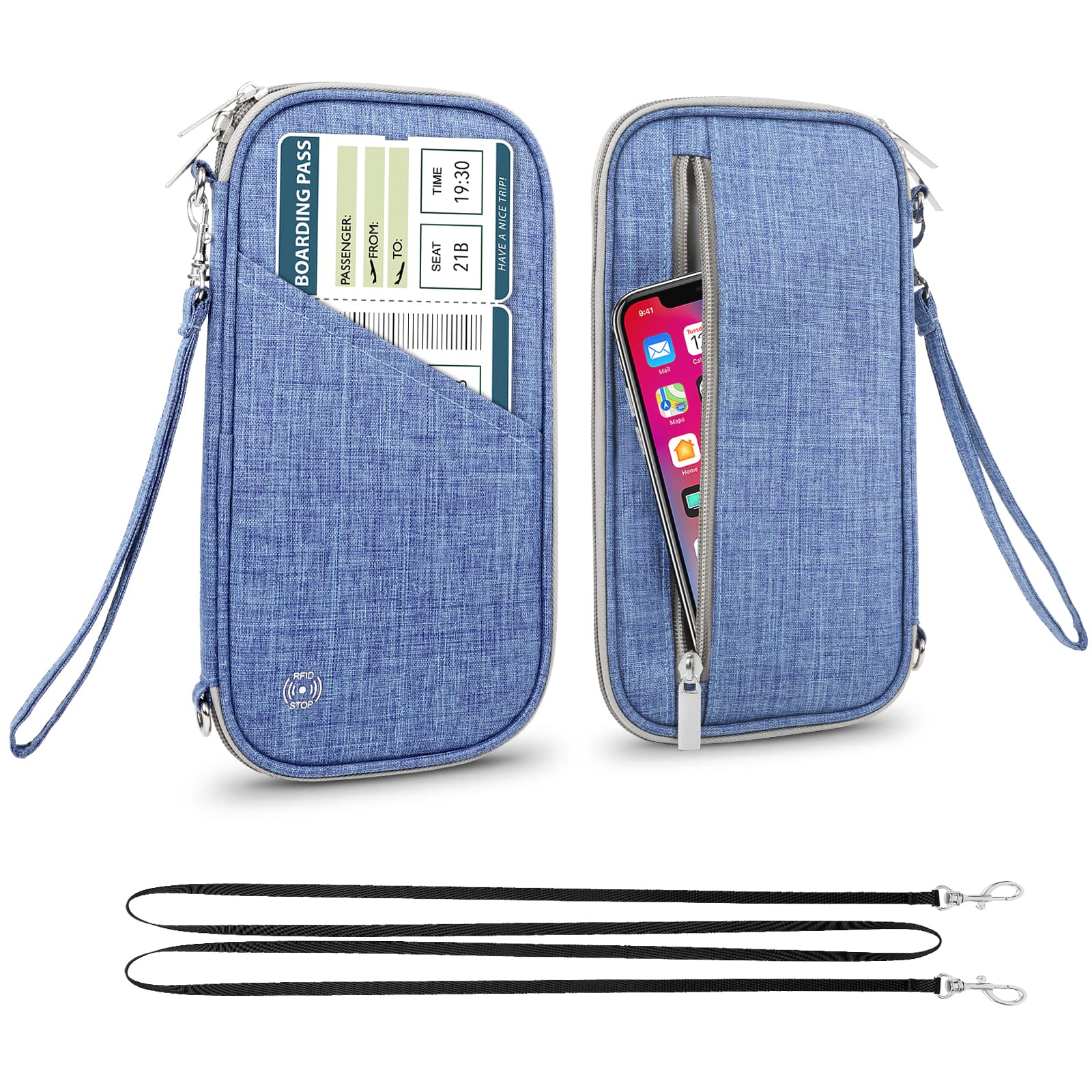 Travel Passport Wallet with RFID Shielding, Crossbody Strap and Wristlet Strap (Blue)