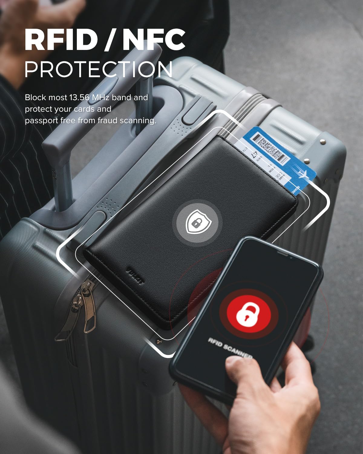 - ADVANCED RFID/NFC PROTECTION: Professional tested RFID/NFC blocking material & technology keep you safe from fraud scanning.