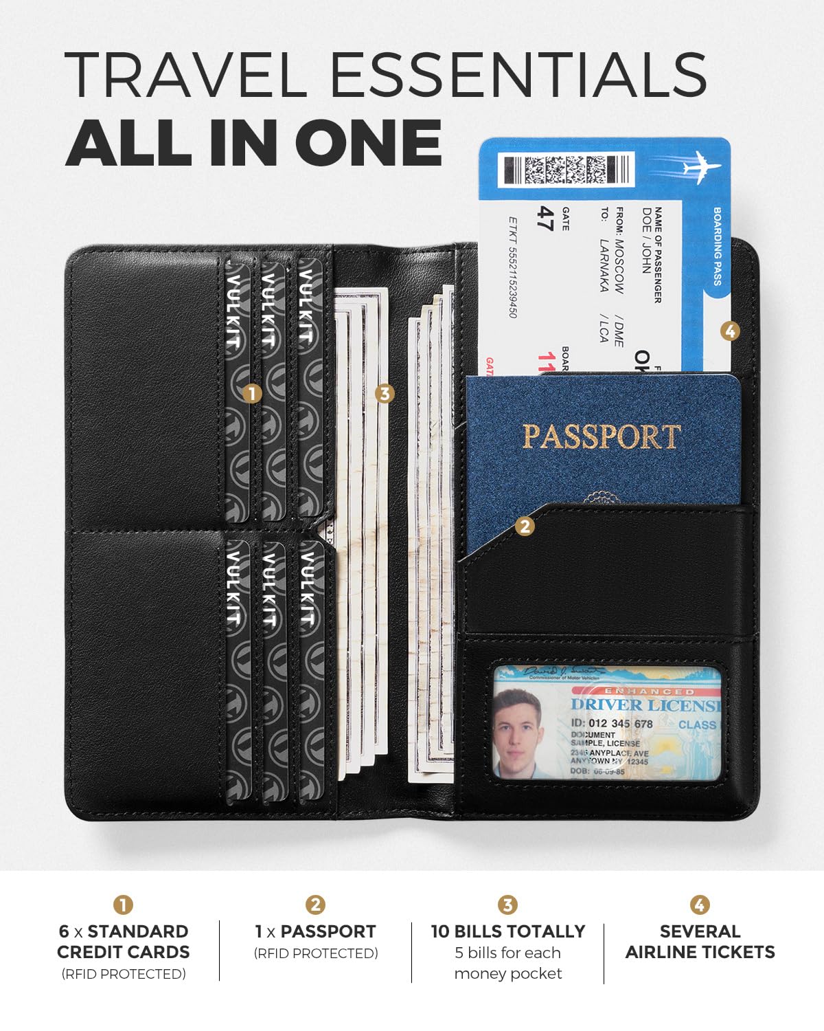 - GET EVERYTHING IN ONE: Available for 6*credit cards, 1*ID license, 1*passport and air tickets. Also, you can put 10 bills into two cash pockets.