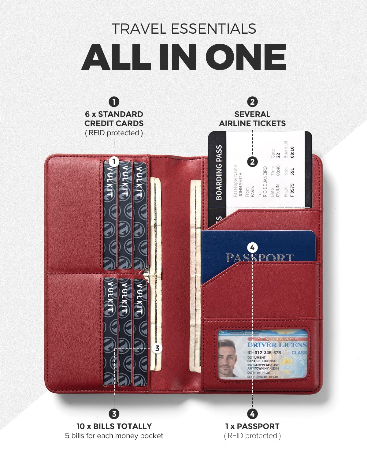- GET EVERYTHING IN ONE: Available for 6*credit cards, 1*ID license, 1*passport and air tickets. Also, you can put 10 bills into two cash pockets.
