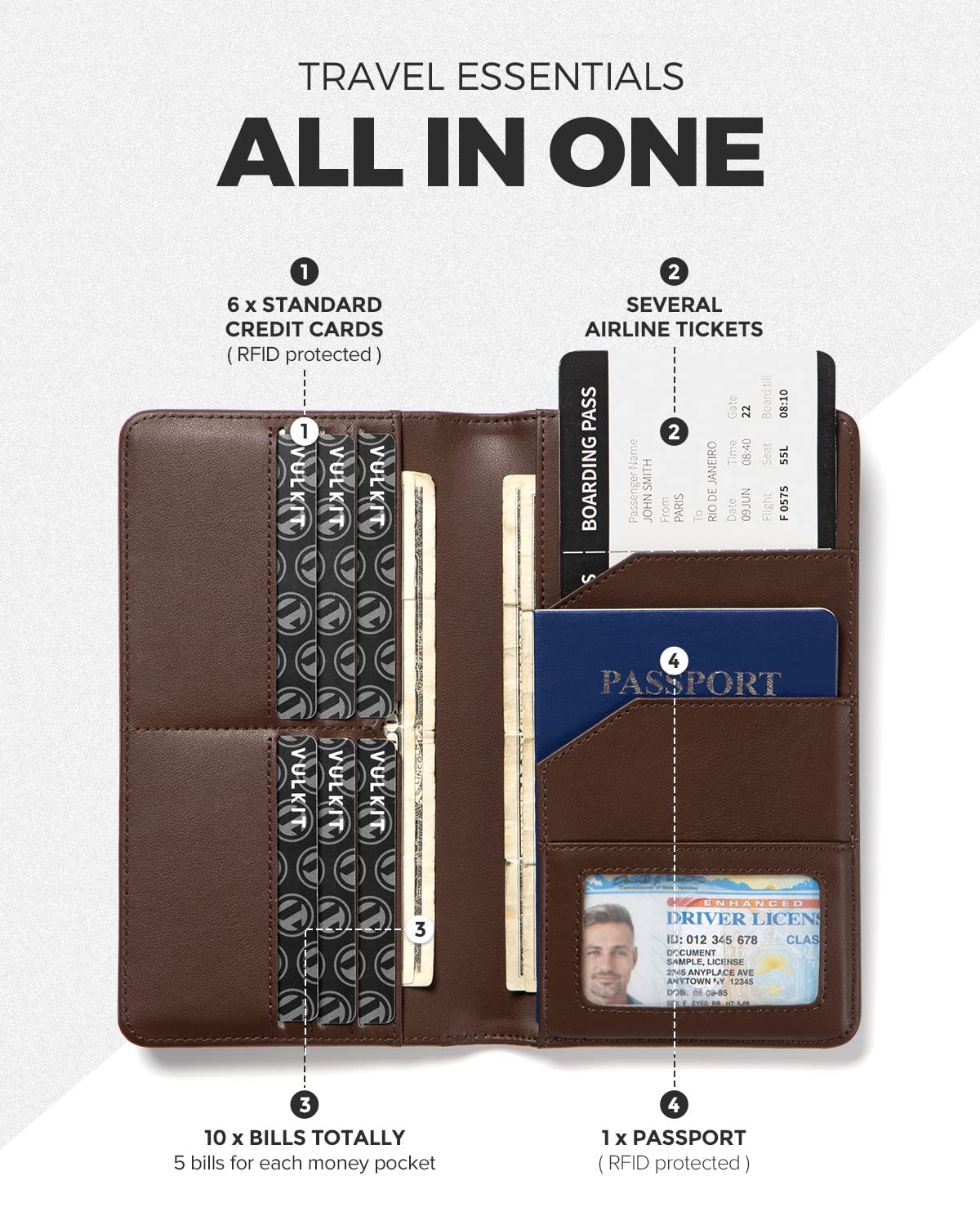 - GET EVERYTHING IN ONE: Available for 6*credit cards, 1*ID license, 1*passport and air tickets. Also, you can put 10 bills into two cash pockets.