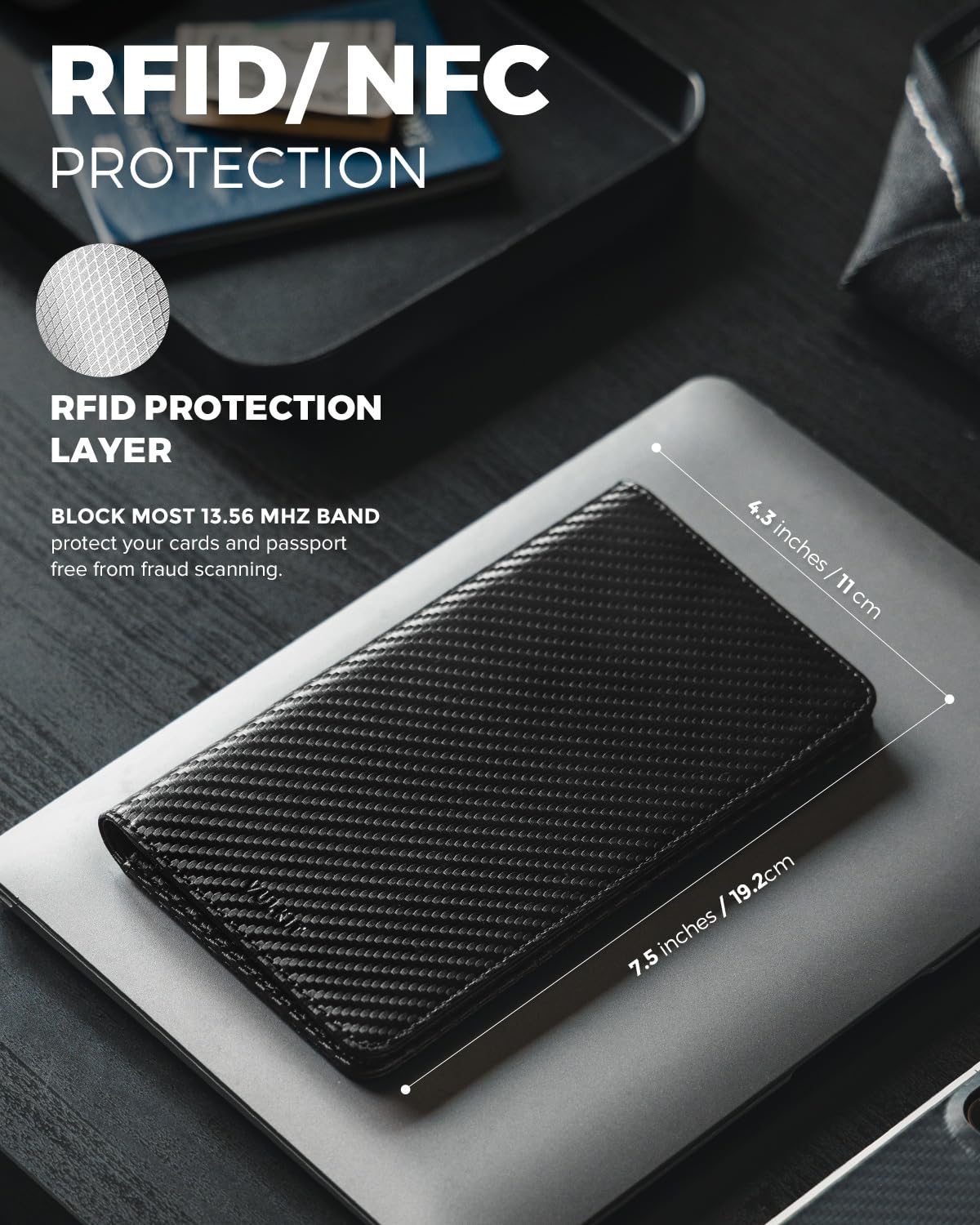 - ADVANCED RFID/NFC PROTECTION: Professional tested RFID/NFC blocking material & technology keep you safe from fraud scanning.