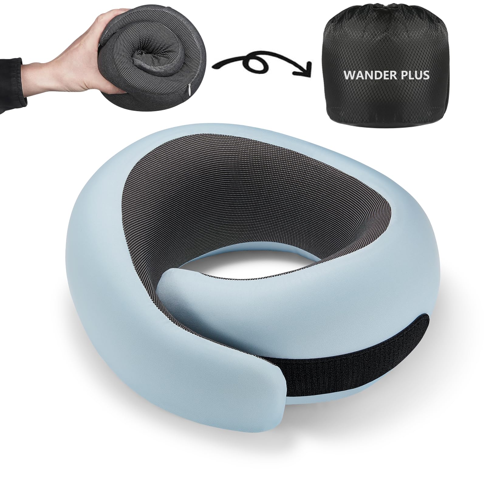 WANDER PLUS® Genuine Travel Pillow, 100% Pure Memory Foam Neck Pillow for Airplanes, Comfortable Breathable Cover, 360° Support Stowable Pillows for Sleeping, Car, Airport Travel Essentials Sky Blue